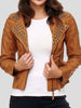 In this premium jacket, there are countless captivating aspects introduced. The Fashionable Studded Brown Women Biker Leather Jacket is a continuation of premium new real leather with an interior thick covering that is sewn in to keep you warm and comfortable. Its components include a peak lapel neck area with zipper cuffs, two storage pockets on the belly with zippers, and a front zipper closure.