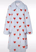 Wearing a Heart Printed White Shearling Long Coat can add a fresh appeal to your wardrobe if you're a fashion enthusiast. You will look lovely in the white coat with the red hearts. The coat's high-quality shearling construction will keep you comfortable no matter how long you wear it. The shirt-style collar, buttoned closure, and side flapped pockets on the Heart Shearling Long Coat with Buttoned Closure are great characteristics that show off the coat's superb tailoring. Wear a White Shearling Long Coat with Buttoned Closure over your casual attire to elevate your appearance if you want to win over everyone with your fashion sense.