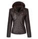 Women Mid Length Detachable Hoodie Biker Leather Jacket
