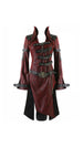 Women Red Punk Rave Shadow Long Distressed Leather Coat in a highly detailed post-apocalyptic Steampunk design is made of a soft, lightweight red leather-effect fabric. Firstly, an asymmetrical design with an uneven paneled hemline on the front and back, a slanted double-ended front zip fastening with metal crucifix zipper pulls, four snap-fastening fake leather straps across the chest, and a special embossed bronze cross pattern are all included. Additionally, the chest straps and matching waist belt both have oversized bronze skull buckles so you may change up your appearance as you choose. In addition to the unusual over-long pointed collar with cross appliques, the shoulders and sleeves have matching embossed real leather embellishments. Moreover, embossed golden cross trim and Punk Rave press-studs finish the black leather panel on the shoulders and upper back!